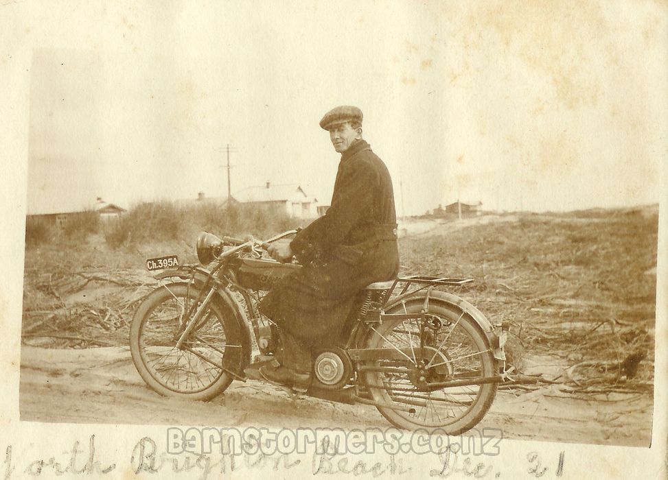 Barnstormers are not interested in showing any of the devastation that has resulted from the earthquake, there has been enough stories, pictures, and film footage blasted around the world from the hordes of rough neck reporters who are all after ‘that personal scoop’. Instead we would much rather look upon gentler times and what it meant to be a pioneer motorcyclist. With this in mind we would like to share a photograph album with you that came our way of one mans love for his motorcycle and friends. It is from around the Christchurch area, circa 1921 to 1925, and includes road trips, excellent rider/machine photographs, and some early racing. Sadly we have no information on the rider/riders nor family and only acquired the photograph album after it was discarded in the rubbish however by the amount of photographs of motorcycles and places the owner must have loved riding. A couple of the place names may seem different from modern day however these are as written by the owner. Enjoy.
